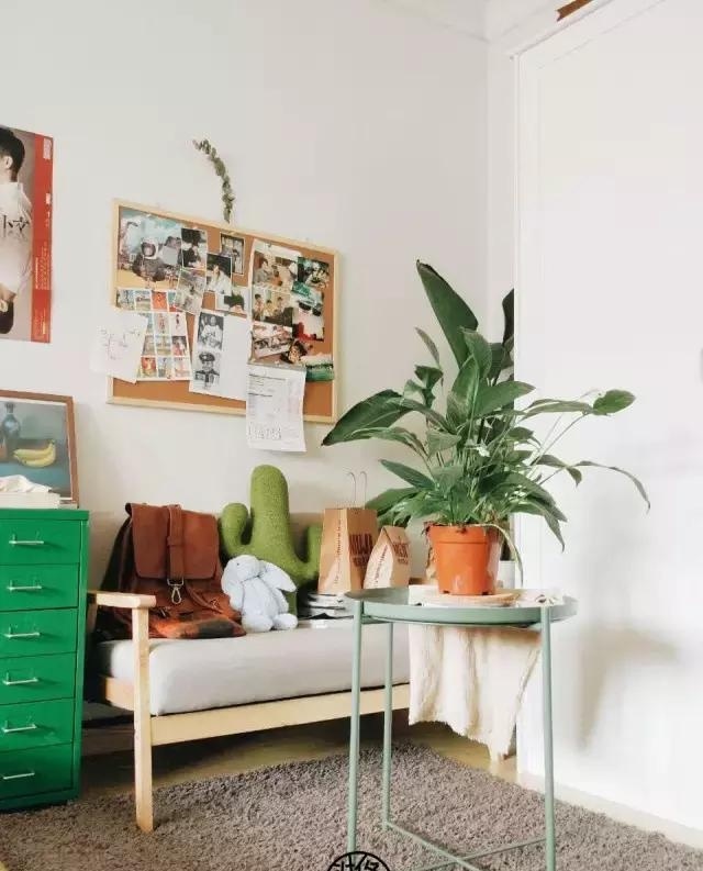 綠色的鐵皮柜是帶輪子的,可隨意的更換位置。別看它小小個(gè)的,收納著實(shí)不錯(cuò),時(shí)而還充當(dāng)床頭柜。